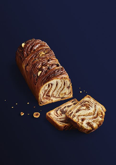 Abaisser la pâte à 2,5 mm d’épaisseur sur 30 cm de large. Étaler 600 g de pâte à tartiner (35°C) et parsemer de noisettes concassées et de pépites de chocolat noir. Rouler, couper en quatre et mettre quelques minutes au congélateur. Couper chaque boudin en 2 dans la longueur. Torsader en partant du centre (attention de ne pas étirer au-delà de la longueur du moule). Disposer dans les moules à cake beurrés et faire pousser 3h30 / 4 heures à 26°C. Cuire au four ventilé à 155°C pendant 35 minutes environ, tourner à mi-cuisson. Napper de sirop avec un pinceau à la sortie du four.