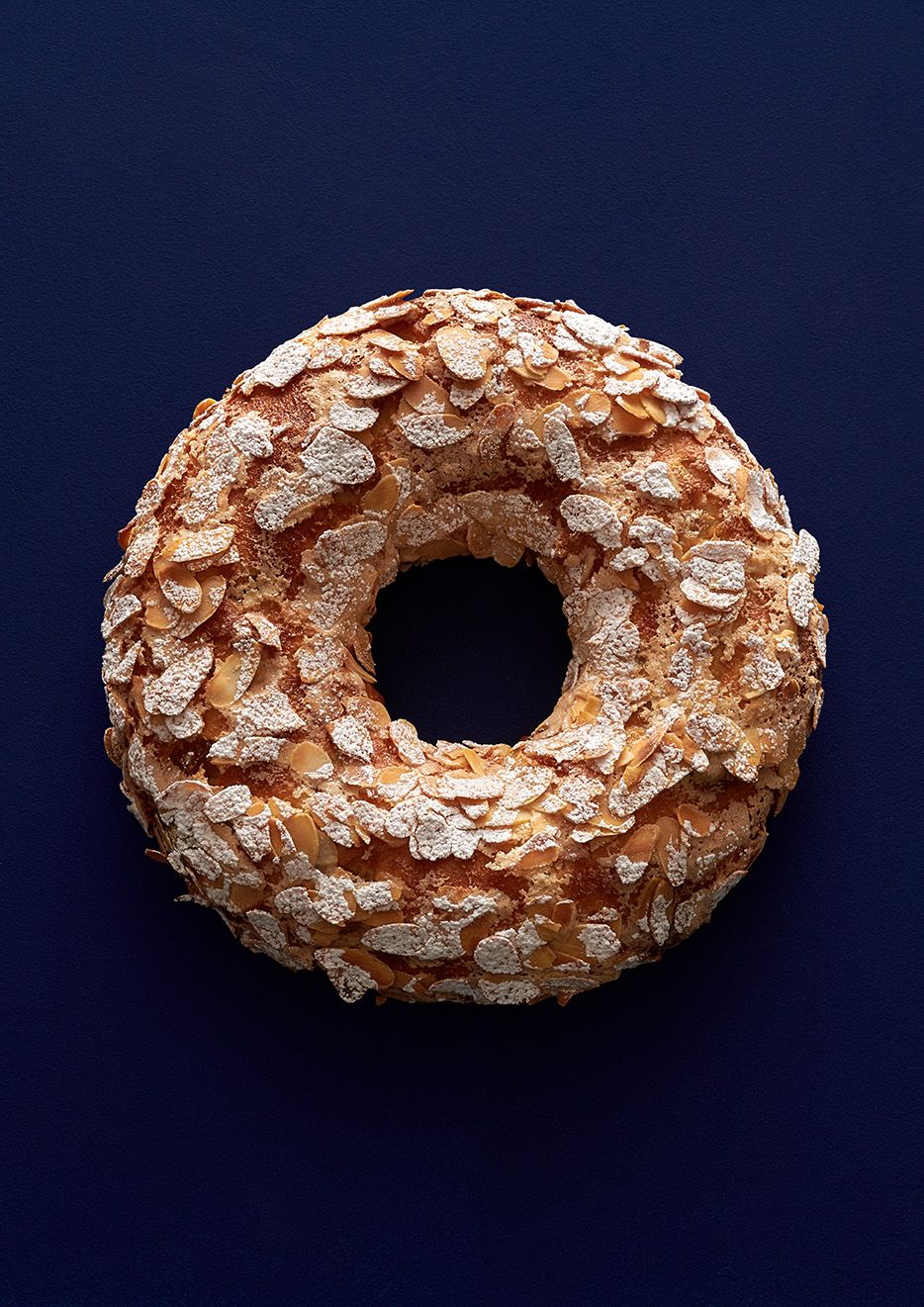 Laisser reprendre au froid. Pocher 50 g de glaçage macaronade sur la couronne briochée. Étaler délicatement sur toute la surface de la couronne avec une palette. Parsemer de 40 g d’amandes effilées et saupoudrer de sucre glace. Cuire au four ventilé à 175°C pendant 20 minutes environ (oura fermé).