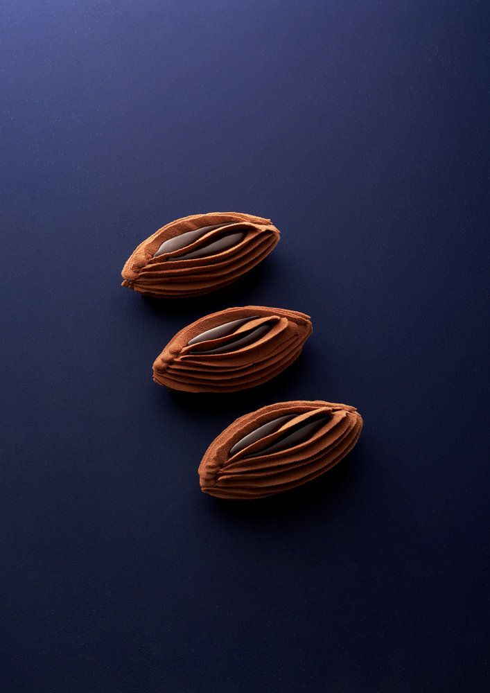 - Pocher la mousse chocolat noir (1/2) dans les moules barquette Silikomart® ref SQ254, enfoncer l’insert et lisser. Mettre au congélateur. Démouler. Pocher à nouveau la mousse au chocolat (2/2) dans les moules barquette pour réaliser une seconde tournée. Lisser et coller la première tournée dessus en retournant les barquettes. Mettre au congélateur puis démouler. Disposer sur Silpat (insert vers le haut). Rabattre la mousse chocolat restante et pocher sur les 2 côtés, 3 lignes à l’aide d’une douille pétale n°103. Mettre au congélateur. Retourner les petits gâteaux. Réaliser à nouveaux 4 lignes de mousse chocolat (sur chaque côté) et une sur le dessus des petits gâteaux. Mettre au congélateur.