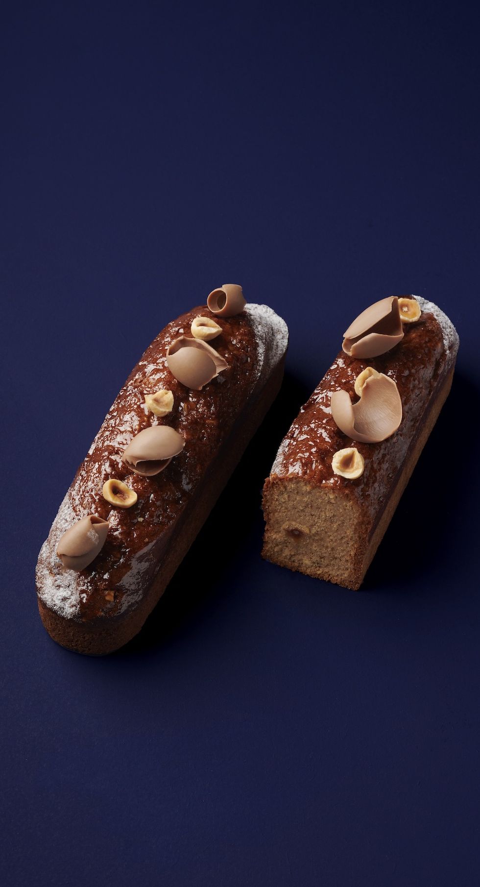 Napper le dessus des cakes, saupoudrer les extrémités de sucre glace décor puis décorer avec des demi-noisettes torréfiées et des copeaux de gianduja lait.