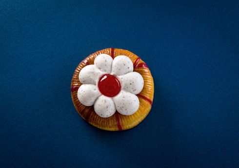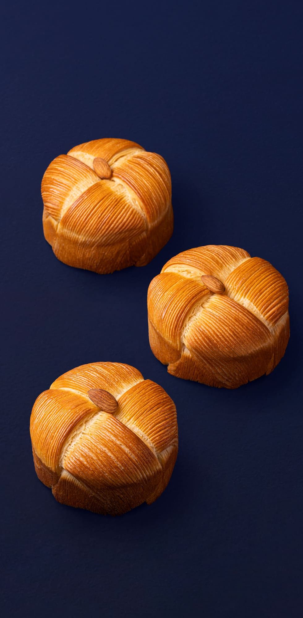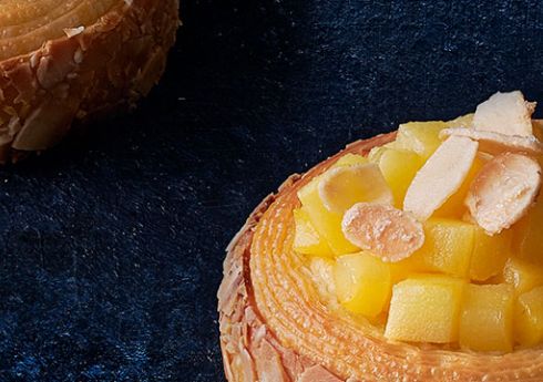 Recouvrer avec les chutes de pâte et fermer le chausson. Enfin, placer le chausson dans un moule de 10 cm de diamètre. Laisser lever pendant 1 heure et 30 minutes à 27 °C, avant de cuire à 170 °C dans un four à convection pendant 18 minutes.