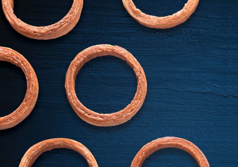 Abaisser le pâton à 39 cm de largeur et 2 cm d’épaisseur, puis découper des bandes de 5 mm de largeur (attention de découper dans le sens de l’étalage). Déposer ces bandes sur le pâton dans le sens de l'étalage également (horizontal). Abaisser à 6 mm et détailler des bandes de 15 cm (sens vertical) puis détailler des rectangles de 5 cm de large (horizontal) (70 g). Réaliser deux incisions dans la longueur (en laissant 1 cm sur un petit côté) puis tresser. Rouler la tresse sur elle-même puis souder la fermeture. Faire pousser dans des moules Silform Ref 915G35 pendant 2 heures à 26°C (70% d’humidité). Laisser reprendre 10 minutes à température ambiante (20°C). Préchauffer le four ventilé à 190°C et cuire à 170°C pendant 12 minutes puis à 165°C pendant 4 minutes environ (pour que la pâte colorée ne prenne pas trop de couleur).