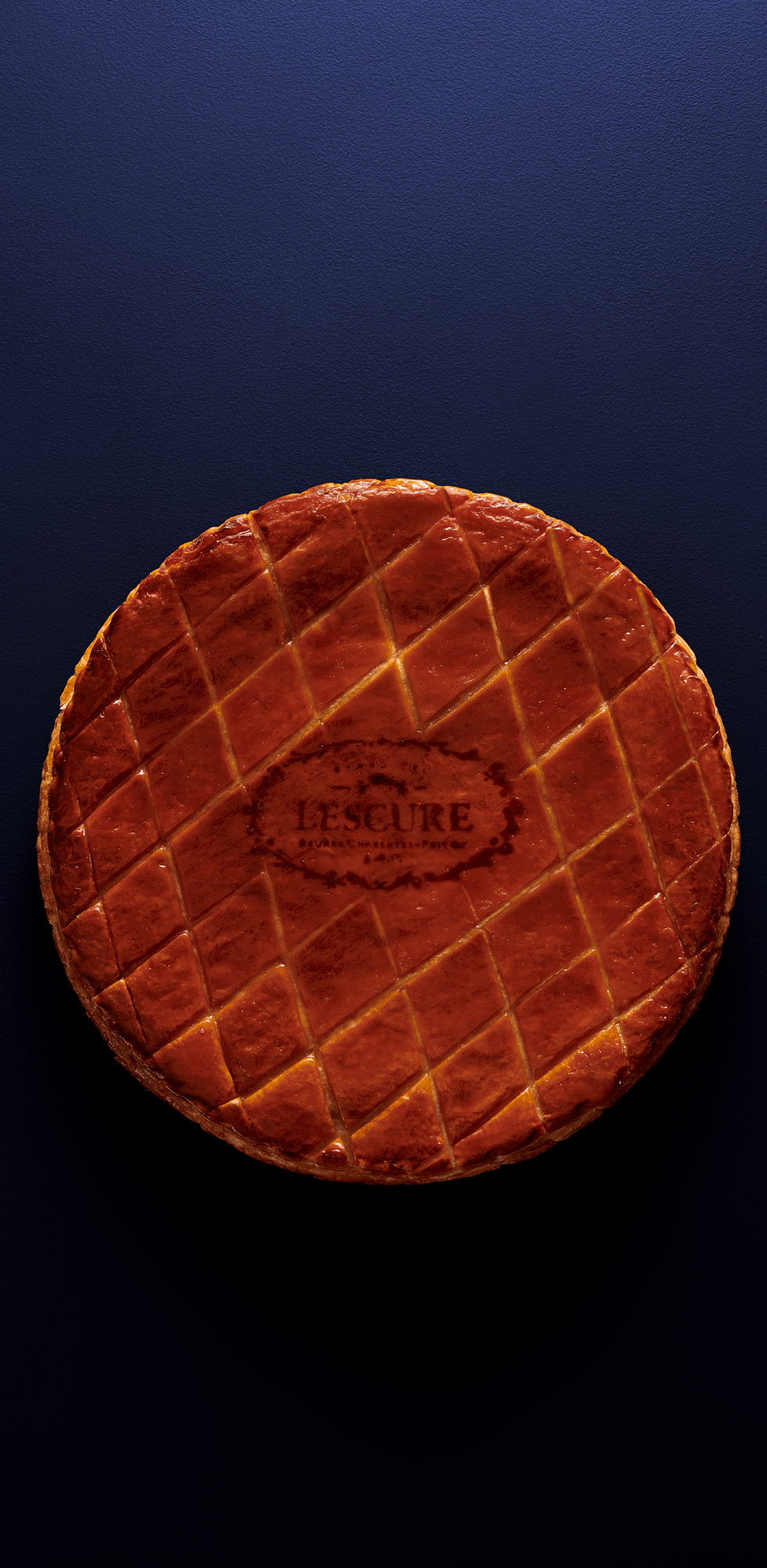 Déposer un insert de frangipane au centre d’un disque de feuilletage. Humidifier les bords avec de l’eau et un pinceau. Refermer la galette avec un autre disque de feuilletage en faisant un quart de tour (pour une rétractation homogène). Redétailler les galettes à 26 cm de diamètre (optionnel). Chiqueter les galettes puis les retourner. Dorer 2 fois (espacées de 30 minutes au réfrigérateur). Une fois la dorure bien sèche déposer le chablon du logo Lescure et pulvériser une couche de jaune d’œuf mélangé à l’extrait de café.