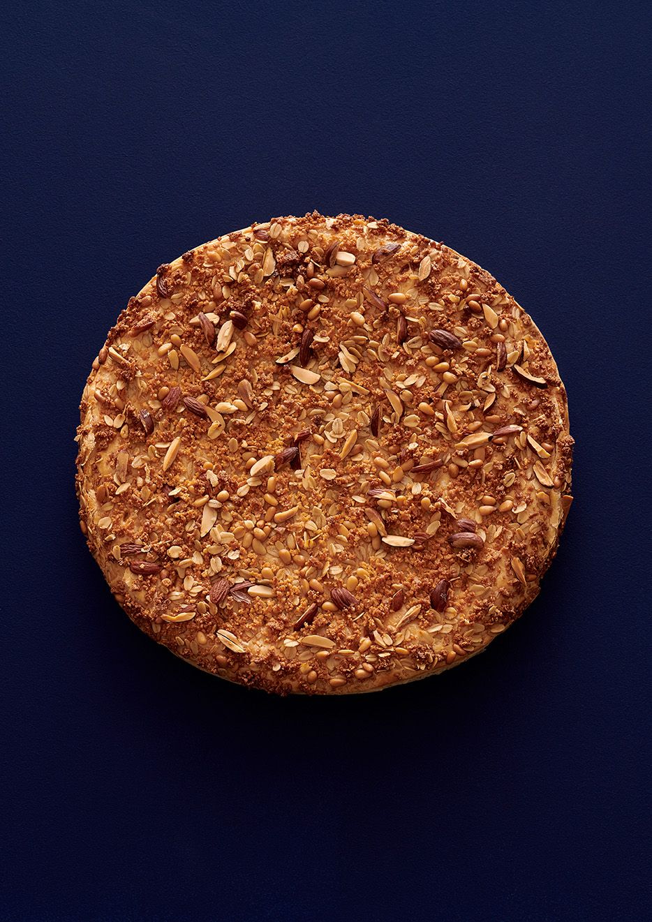 Cuire au four ventilé à 165°C pendant 50 minutes environ (poser une feuille de papier cuisson sur la galette à mi-cuisson pour éviter une coloration excessive du crumble et des fruits secs).