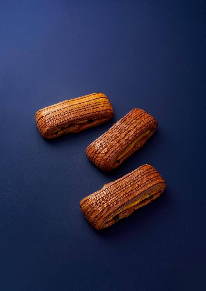 Lisser la crème pâtissière et pocher deux cordons de 16 cm de crème pâtissière cream cheese (40 g) (avec une douille de 12 mm) au centre du rectangle, saupoudrer de pépites de chocolat (10 g).
