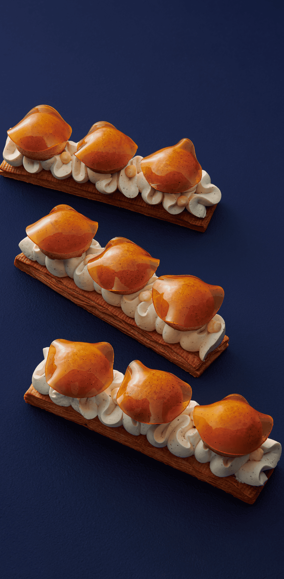 Une fois le finger refroidi, dressez un tube de caramel à l’aide d’une douille n°10. Sur le dessus à l’aide d’une petite douille St-Honoré, pochez de jolies vaguelettes de ganache montée à la fleur d’oranger. Percez vos choux et pochez du crémeux à l’intérieur, déposez le voile et dégustez.