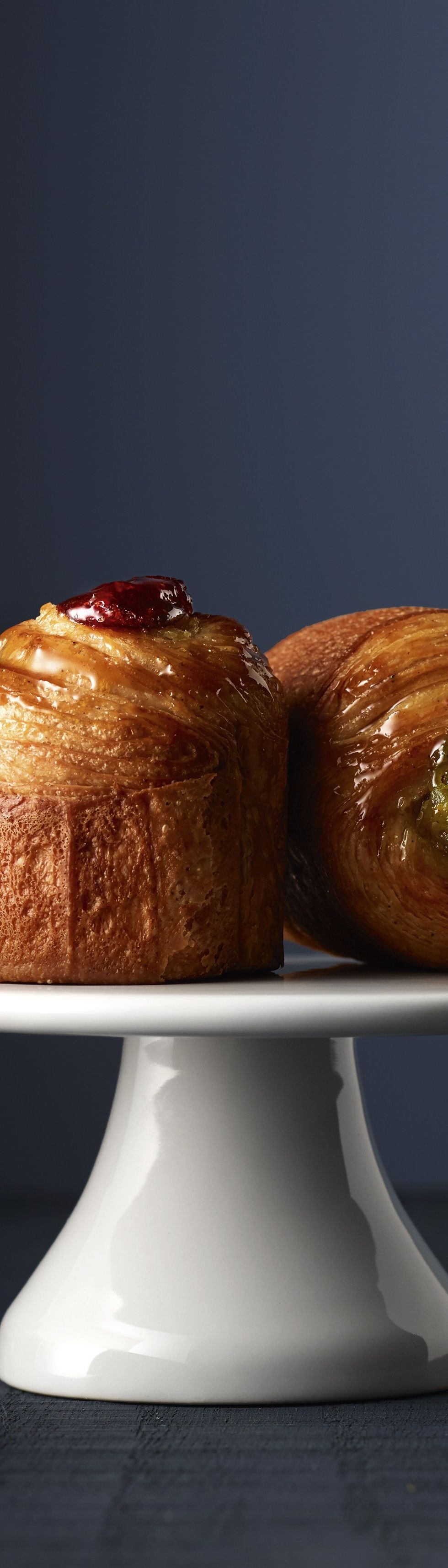 cylindres de 2,5 cm de large soit 22g et les déposer dans des cercles graissés de 4,5 cm de hauteur par 5 cm de diamètre. Faire pousser environ 2h à 25°C. Après la pousse, dorer et insérer la garniture bien au fond de la viennoiserie. Cuire à 165°C sur une plaque à trous pendant environ 17 minutes. A chaud, glacer avec du sirop d’érable pour finir les viennoiseries.Astuce de chef• Pour qu’un produit attire le regard, n’hésitez pas à le mettre en scène : sur un présentoir ou sous-cloche, il deviendra plus appétissant aux yeux de vos clients… • Pour présenter cette nouvelle gamme de façon originale et conviviale, intégrez-les dans une offre « Tea Time ».