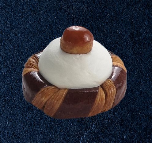 La veille, préparez la Chantilly à la vanille et laissez reposer toute la nuit dans un réfrigérateur à +4°C. Réaliser la pâte à croissant en respectant toutes les étapes du mélange jusqu'à la superposition. Faites un double tour et un simple tour. Pendant ce temps et entre chaque étape de la fabrication du croissant, réaliser le flan à la vanille et verser la masse dans un moule demi-sphère de 43mm. Conserver dans un congélateur à air comprimé. Préparer la pâte à choux et façonner un petit chou sur un tapis en silicone. Faire cuire dans un four à convection 170°C, 40 minutes, ventilateur OFF, puis 10 minutes ventilateur LOW. Avant la cuisson, "Twist" votre pâte à croissant, détaillée à la taille, 2cm de large, 20 cm de long et 4mm d'épaisseur. Etuver à 27°C pendant 1h30 minutes. Avant la cuisson, déposez le flan congelé au centre du croissant et faites cuire 15 minutes, 170°C, ventilateur élevé, déclencheur ON. Lorsque le "Twist" est tiède, déposer un chou caramélisé sur le dessus et recouvrir de chantilly et décorer avec un autre chou.